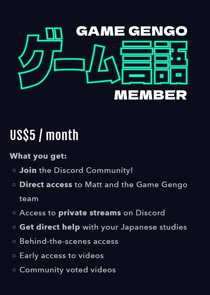 By joining the community as a member at Game Gengo you will be given access to the community discord where you can connect with me, and other members, students, and video game enthusiasts who are passionate about both video games and Japanese as we help each other learn Japanese and have fun getting to know each other!